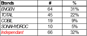 The identified players as independent is actually an important number of operators that can own from 1 to 3 gas stations ( 6 for the biggest ) spreaded in the city , with their own brands , and that have a non-negligible impact in the market .