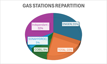 Engen has been in the DRC since 2007. Leading the aviation fuel market with 50% of market share, Engen is present in 10 major airports in DR Congo, but also leading the gas station network in the country and mainly in Kinshasa, the capital that has close to 17 Million inhabitant. The estimated number of gas station within the country is around 204 actives ( 41 inactive or under construction as of end of 2024), with the following repartition :